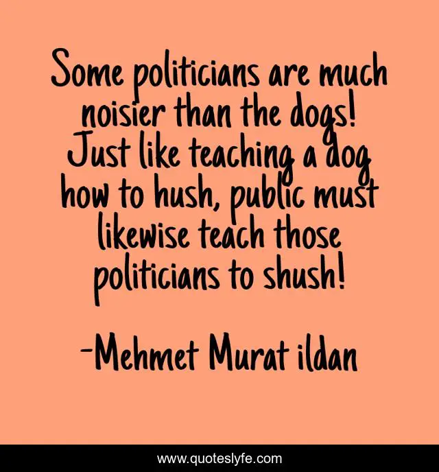 This page presents the quote "Some politicians are much noisier than the dogs! Just like teaching a dog how to hush, public must likewise teach those politicians to shush!". Author of this quote is Mehmet Murat ildan. This quote is about murat-ildan, shush, hush, politicians, turkish-writers, politics,.
