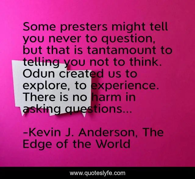 This page presents the quote "Some presters might tell you never to question, but that is tantamount to telling you not to think. Odun created us to explore, to experience. There is no harm in asking questions…". Author of this quote is Kevin J. Anderson, The Edge of the World. .