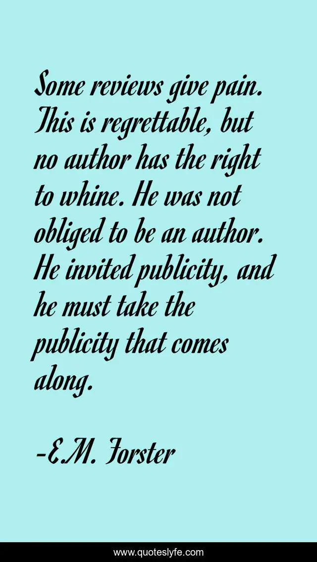 This page presents the quote "Some reviews give pain. This is regrettable, but no author has the right to whine. He was not obliged to be an author. He invited publicity, and he must take the publicity that comes along.". Author of this quote is E.M. Forster. This quote is about criticism, critics, reviews,.