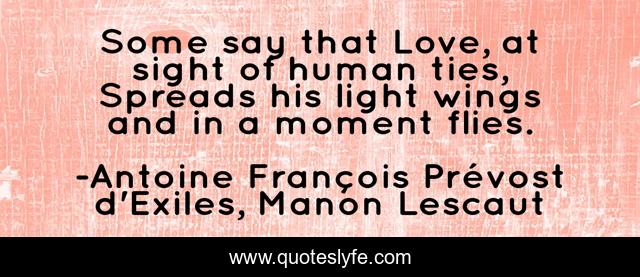 This page presents the quote "Some say that Love, at sight of human ties, Spreads his light wings and in a moment flies.". Author of this quote is Antoine François Prévost d'Exiles, Manon Lescaut. This quote is about relationships, loss, lovers, love, affection,.