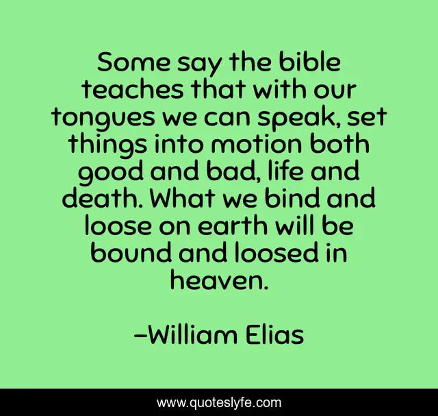 This page presents the quote "Some say the bible teaches that with our tongues we can speak, set things into motion both good and bad, life and death. What we bind and loose on earth will be bound and loosed in heaven.". Author of this quote is William Elias. This quote is about police, fiction-novel, drama, spirituality, suspense, thriller,.