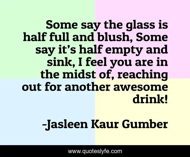 This page presents the quote "Some say the glass is half full and blush, Some say it’s half empty and sink, I feel you are in the midst of, reaching out for another awesome drink!". Author of this quote is Jasleen Kaur Gumber. This quote is about life, glass-half-full, optimism, glass, half, life-philosophy, halfway,.