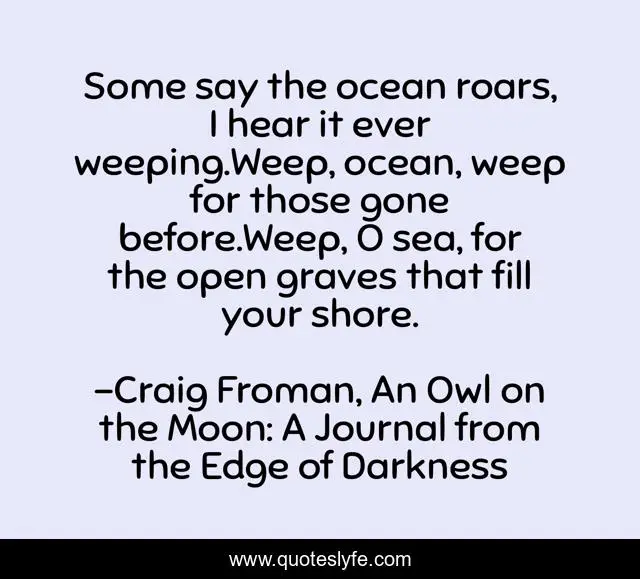 This page presents the quote "Some say the ocean roars, I hear it ever weeping.Weep, ocean, weep for those gone before.Weep, O sea, for the open graves that fill your shore.". Author of this quote is Craig Froman, An Owl on the Moon: A Journal from the Edge of Darkness. This quote is about roars, weep, pain, weeping, ocean,.