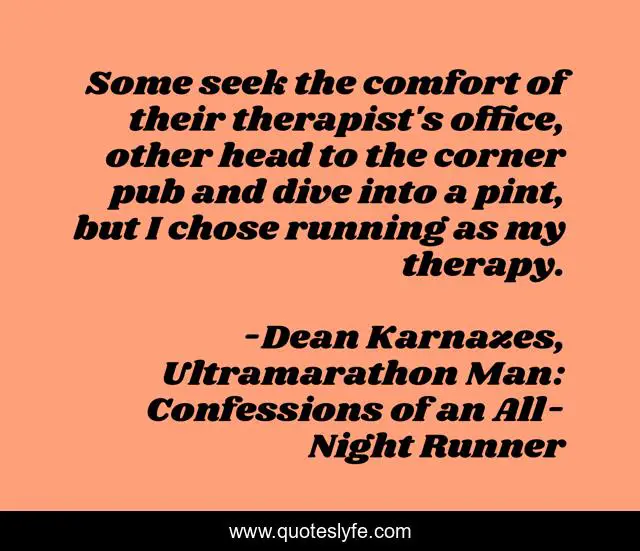 This page presents the quote "Some seek the comfort of their therapist's office, other head to the corner pub and dive into a pint, but I chose running as my therapy.". Author of this quote is Dean Karnazes, Ultramarathon Man: Confessions of an All-Night Runner. This quote is about running, mental-health, therapy, sports,.