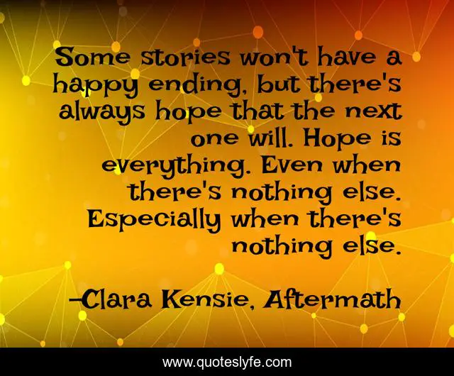 This page presents the quote "Some stories won't have a happy ending, but there's always hope that the next one will. Hope is everything. Even when there's nothing else. Especially when there's nothing else.". Author of this quote is Clara Kensie, Aftermath. This quote is about strength-of-spirit, kidnapping, recovery, family, sacrifice, clara-kensie, triumph-over-tragedy, strength, hope,.
