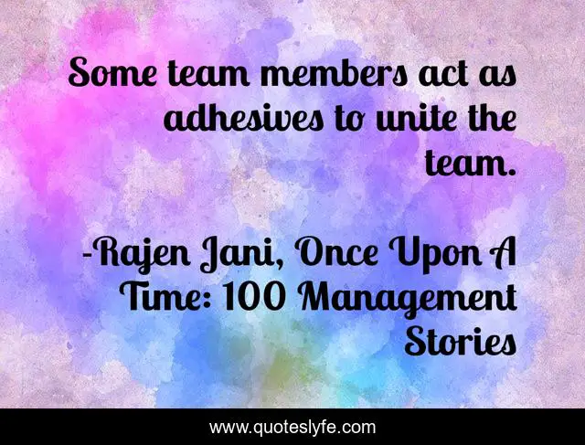 This page presents the quote "Some team members act as adhesives to unite the team.". Author of this quote is Rajen Jani, Once Upon A Time: 100 Management Stories. This quote is about motivation, communication, sales, management-theory, anger, improvement, quality, knowledge, strategy,.