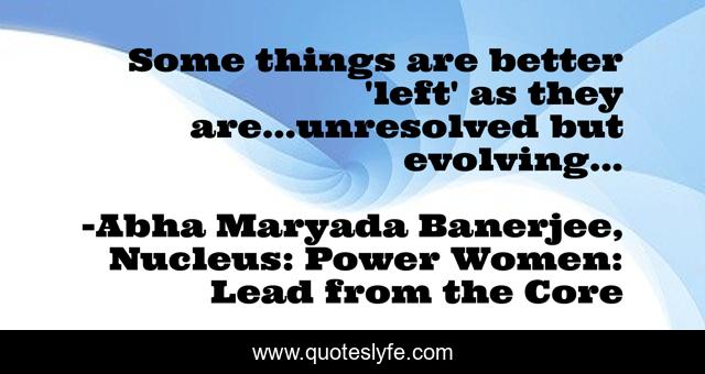This page presents the quote "Some things are better 'left' as they are...unresolved but evolving...". Author of this quote is Abha Maryada Banerjee, Nucleus: Power Women: Lead from the Core. This quote is about life, truth-of-life, love, affection,.