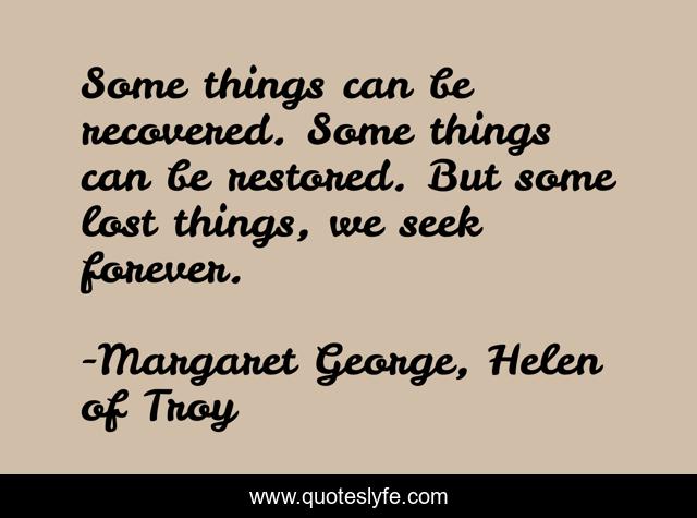 This page presents the quote "Some things can be recovered. Some things can be restored. But some lost things, we seek forever.". Author of this quote is Margaret George, Helen of Troy. This quote is about mythology, historical-fiction,.