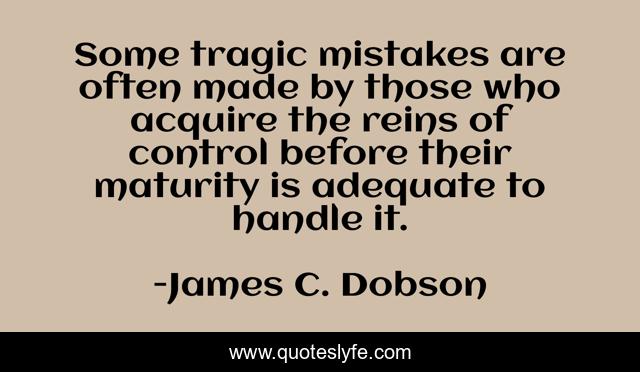 This page presents the quote "Some tragic mistakes are often made by those who acquire the reins of control before their maturity is adequate to handle it.". Author of this quote is James C. Dobson. This quote is about control, handle, maturity, acquire, reins, their, mistakes, tragic, adequate,.