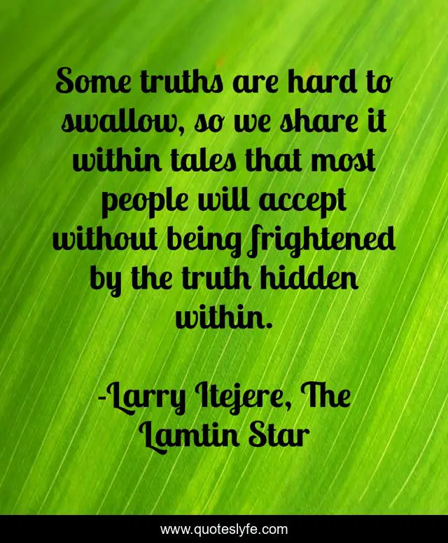 This page presents the quote "Some truths are hard to swallow, so we share it within tales that most people will accept without being frightened by the truth hidden within.". Author of this quote is Larry Itejere, The Lamtin Star. This quote is about fiction-novel, action-adventure, young-adult-fiction, fantasy,.
