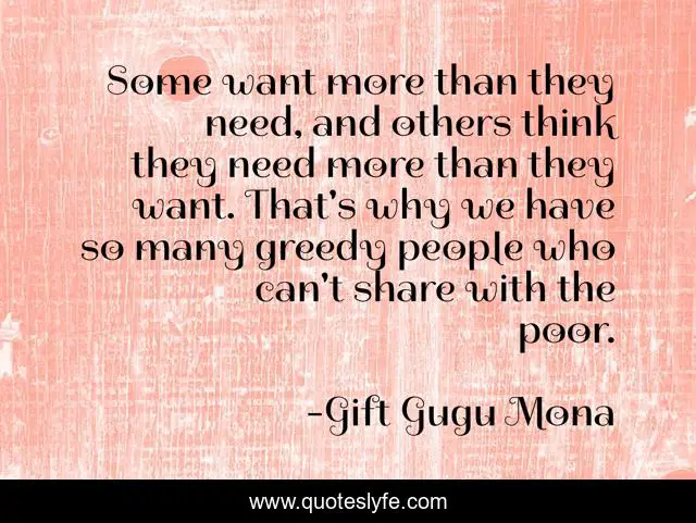 This page presents the quote "Some want more than they need, and others think they need more than they want. That's why we have so many greedy people who can't share with the poor.". Author of this quote is Gift Gugu Mona. This quote is about need, poor, think, greedy,.