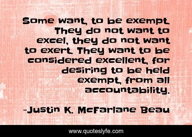 This page presents the quote "Some want, to be exempt. They do not want to excel, they do not want to exert. They want to be considered excellent, for desiring to be held exempt, from all accountability.". Author of this quote is Justin K. McFarlane Beau. This quote is about desire, exertion, commonality, exemption, exert, weakness, accountability, normalcy, accountable,.