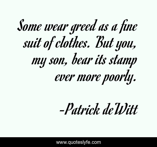 This page presents the quote "Some wear greed as a fine suit of clothes. But you, my son, bear its stamp ever more poorly.". Author of this quote is Patrick deWitt. .