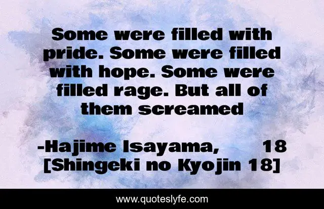 This page presents the quote "Some were filled with pride. Some were filled with hope. Some were filled rage. But all of them screamed". Author of this quote is Hajime Isayama, 進撃の巨人 18 [Shingeki no Kyojin 18]. This quote is about pride, hope, rage,.
