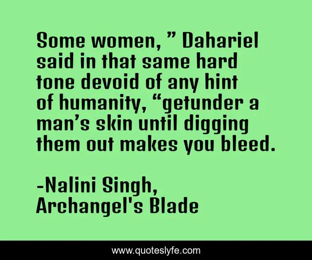 This page presents the quote "Some women, ” Dahariel said in that same hard tone devoid of any hint of humanity, “getunder a man’s skin until digging them out makes you bleed.". Author of this quote is Nalini Singh, Archangel's Blade. This quote is about dahariel, archangel-s-blade, angels, nalini-singh, paranormal-romance,.