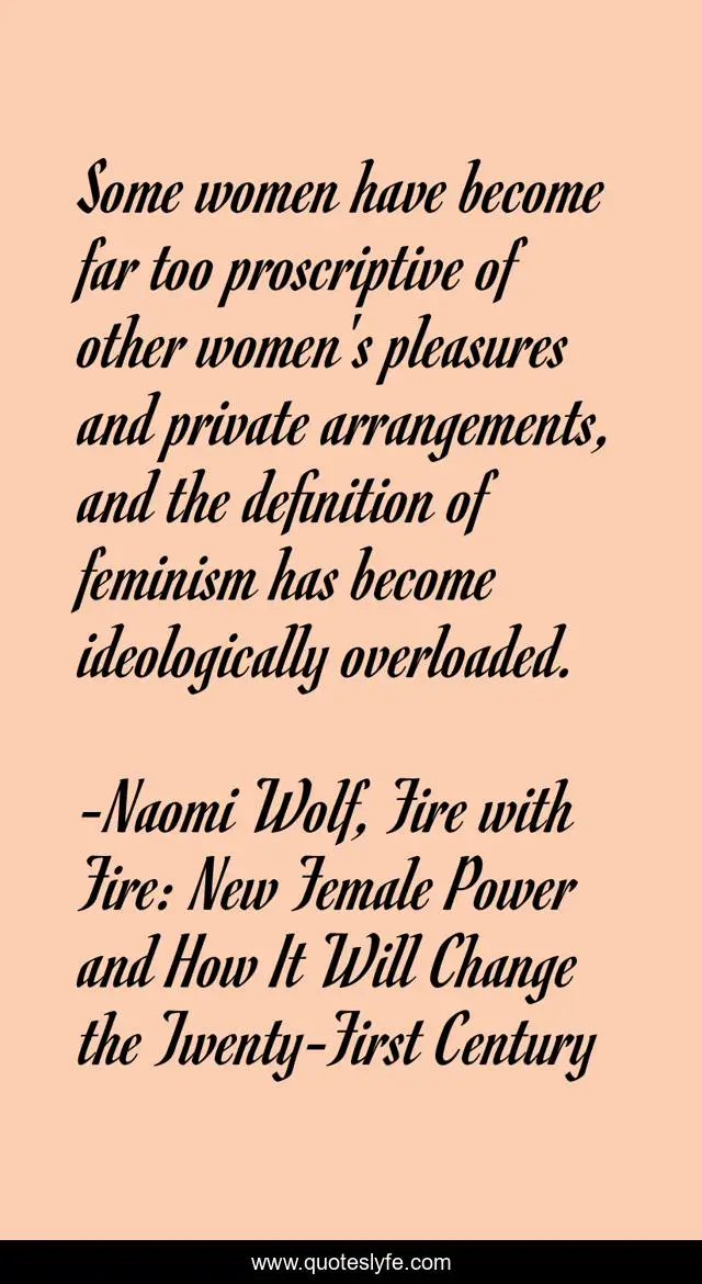 This page presents the quote "Some women have become far too proscriptive of other women's pleasures and private arrangements, and the definition of feminism has become ideologically overloaded.". Author of this quote is Naomi Wolf, Fire with Fire: New Female Power and How It Will Change the Twenty-First Century. .