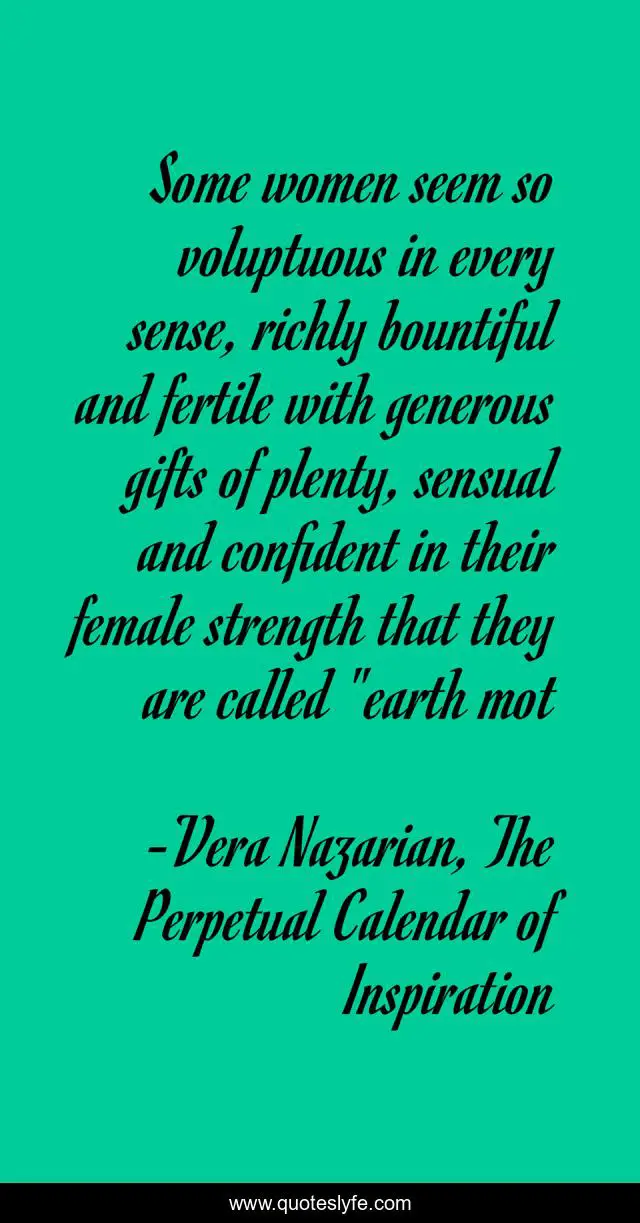 This page presents the quote "Some women seem so voluptuous in every sense, richly bountiful and fertile with generous gifts of plenty, sensual and confident in their female strength that they are called "earth mot". Author of this quote is Vera Nazarian, The Perpetual Calendar of Inspiration. This quote is about woman, inspiration, earth-mother, days, rich, earth, voluptuousness, day, women,.