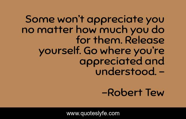 This page presents the quote "Some won’t appreciate you no matter how much you do for them. Release yourself. Go where you’re appreciated and understood. –". Author of this quote is Robert Tew. This quote is about appreciation, love, relationship, affection, understanding,.