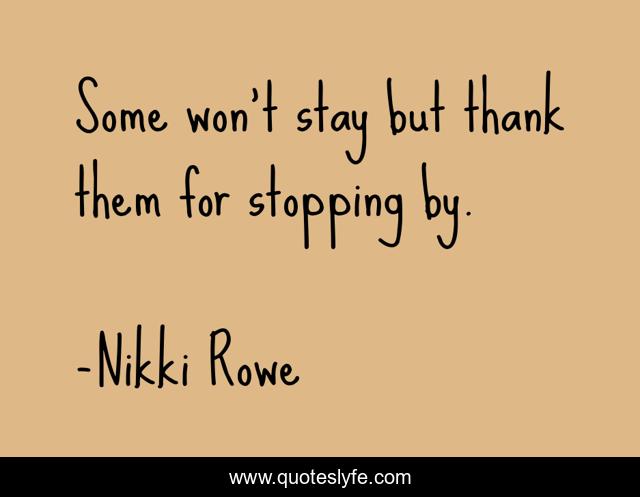 This page presents the quote "Some won't stay but thank them for stopping by.". Author of this quote is Nikki Rowe. This quote is about courage, life, mindfulness, life-lesson, philosophy, one-step-at-a-time, move-forward, growth, perspective,.