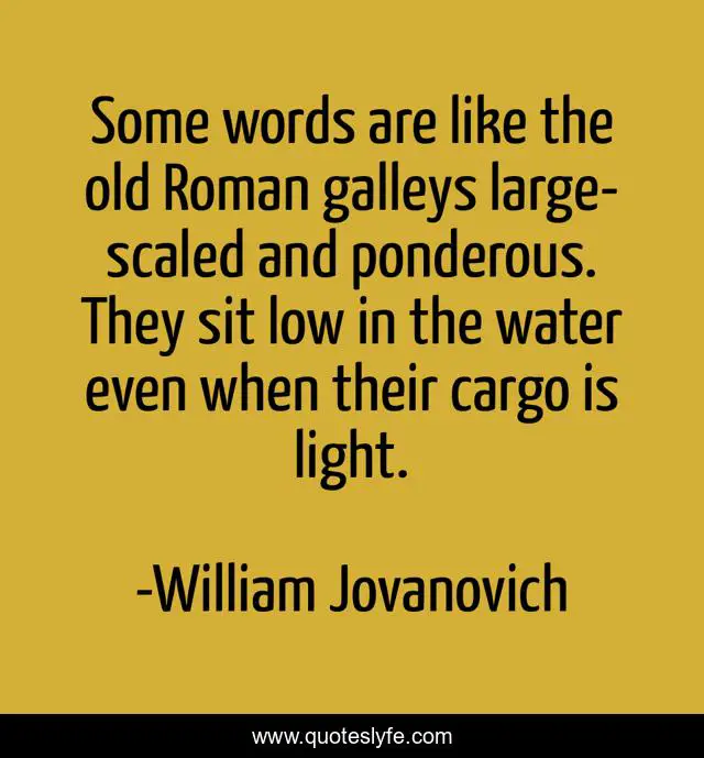 This page presents the quote "Some words are like the old Roman galleys large-scaled and ponderous. They sit low in the water even when their cargo is light.". Author of this quote is William Jovanovich. This quote is about words, language,.