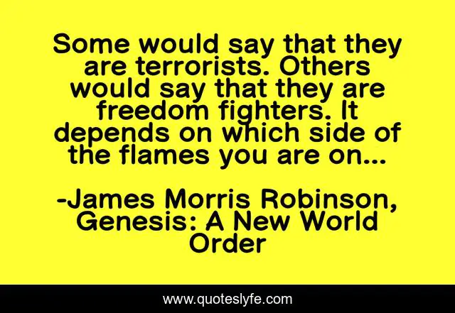 This page presents the quote "Some would say that they are terrorists. Others would say that they are freedom fighters. It depends on which side of the flames you are on...". Author of this quote is James Morris Robinson, Genesis: A New World Order. This quote is about freedom-fighter, terrorism, terrorists,.
