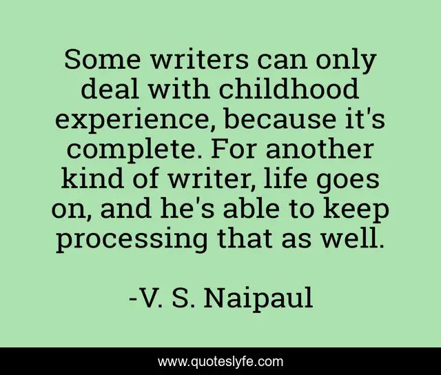 This page presents the quote "Some writers can only deal with childhood experience, because it's complete. For another kind of writer, life goes on, and he's able to keep processing that as well.". Author of this quote is V. S. Naipaul. This quote is about life, childhood, kind,.