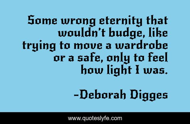 This page presents the quote "Some wrong eternity that wouldn’t budge, like trying to move a wardrobe or a safe, only to feel how light I was.". Author of this quote is Deborah Digges. .