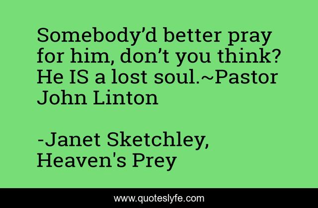 This page presents the quote "Somebody’d better pray for him, don’t you think? He IS a lost soul.~Pastor John Linton". Author of this quote is Janet Sketchley, Heaven's Prey. This quote is about christian-fiction, prayer,.