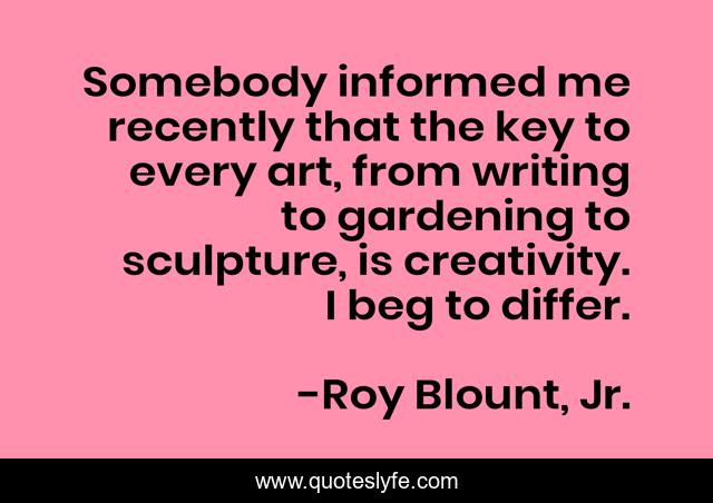 This page presents the quote "Somebody informed me recently that the key to every art, from writing to gardening to sculpture, is creativity. I beg to differ.". Author of this quote is Roy Blount, Jr.. This quote is about art, creativity, writing,.