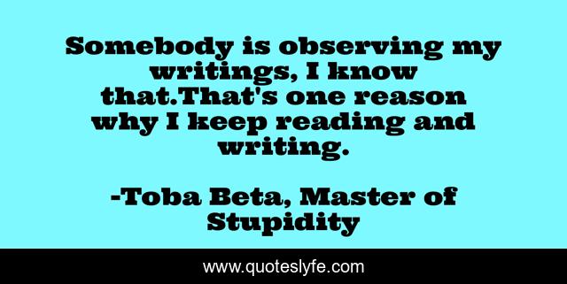 This page presents the quote "Somebody is observing my writings, I know that.That's one reason why I keep reading and writing.". Author of this quote is Toba Beta, Master of Stupidity. This quote is about reading, observing, writing,.