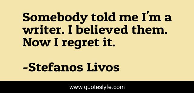 This page presents the quote "Somebody told me I'm a writer. I believed them. Now I regret it.". Author of this quote is Stefanos Livos. This quote is about authorship, writing-life, authors-on-authors, writing,.