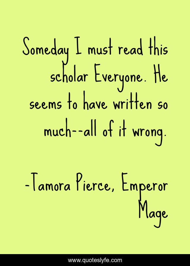 This page presents the quote "Someday I must read this scholar Everyone. He seems to have written so much--all of it wrong.". Author of this quote is Tamora Pierce, Emperor Mage. This quote is about everyone, humor, scholar,.