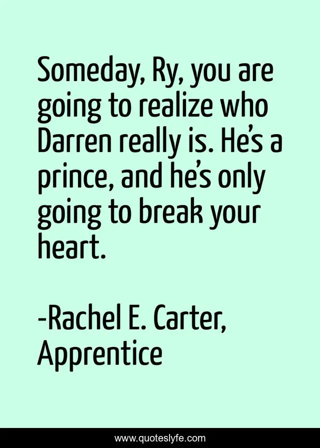 This page presents the quote "Someday, Ry, you are going to realize who Darren really is. He’s a prince, and he’s only going to break your heart.". Author of this quote is Rachel E. Carter, Apprentice. This quote is about magic, ryiah, darren, romance, fantasy, young-adult, prince,.