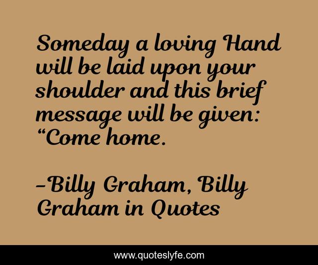 This page presents the quote "Someday a loving Hand will be laid upon your shoulder and this brief message will be given: “Come home.". Author of this quote is Billy Graham, Billy Graham in Quotes. This quote is about death, billy-graham,.