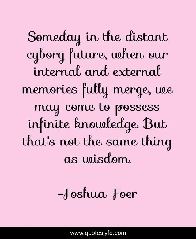 This page presents the quote "Someday in the distant cyborg future, when our internal and external memories fully merge, we may come to possess infinite knowledge. But that's not the same thing as wisdom.". Author of this quote is Joshua Foer. This quote is about memories, future, wisdom,.