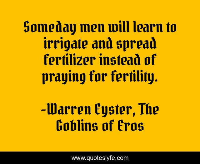 This page presents the quote "Someday men will learn to irrigate and spread fertilizer instead of praying for fertility.". Author of this quote is Warren Eyster, The Goblins of Eros. This quote is about irrigation, farming, irrigation-system, poverty, fertilizer, fertility, agriculture,.