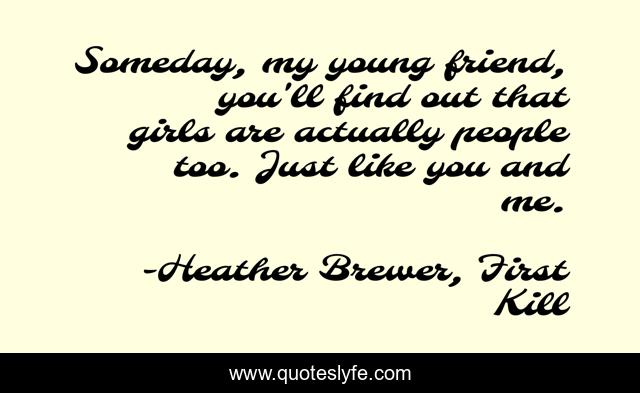 This page presents the quote "Someday, my young friend, you'll find out that girls are actually people too. Just like you and me.". Author of this quote is Heather Brewer, First Kill. This quote is about girls, humor,.
