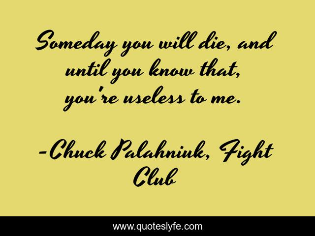 This page presents the quote "Someday you will die, and until you know that, you're useless to me.". Author of this quote is Chuck Palahniuk, Fight Club. This quote is about death, useless,.