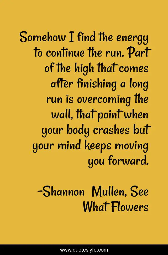 This page presents the quote "Somehow I find the energy to continue the run. Part of the high that comes after finishing a long run is overcoming the wall, that point when your body crashes but your mind keeps moving you forward.". Author of this quote is Shannon Mullen, See What Flowers. This quote is about fitness-inspiration, running, mental-health, health, fitness,.