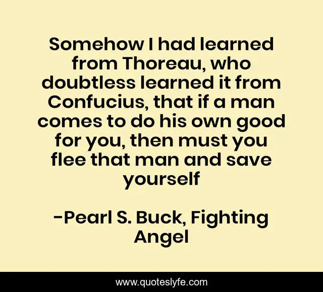 This page presents the quote "Somehow I had learned from Thoreau, who doubtless learned it from Confucius, that if a man comes to do his own good for you, then must you flee that man and save yourself". Author of this quote is Pearl S. Buck, Fighting Angel. .