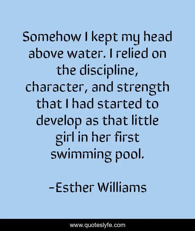 This page presents the quote "Somehow I kept my head above water. I relied on the discipline, character, and strength that I had started to develop as that little girl in her first swimming pool.". Author of this quote is Esther Williams. This quote is about water, girl, character,.