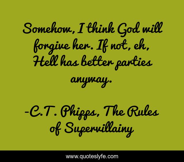 This page presents the quote "Somehow, I think God will forgive her. If not, eh, Hell has better parties anyway.". Author of this quote is C.T. Phipps, The Rules of Supervillainy. This quote is about funny, comedy, hell,.