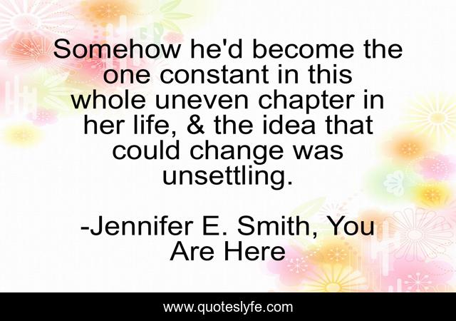 This page presents the quote "Somehow he'd become the one constant in this whole uneven chapter in her life, & the idea that could change was unsettling.". Author of this quote is Jennifer E. Smith, You Are Here. This quote is about friendship, love, affection,.