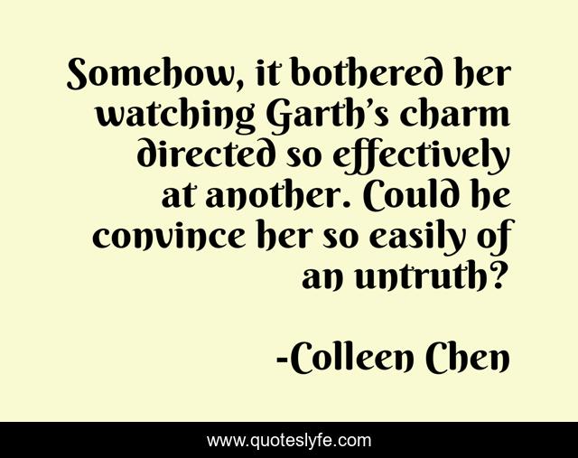 This page presents the quote "Somehow, it bothered her watching Garth’s charm directed so effectively at another. Could he convince her so easily of an untruth?". Author of this quote is Colleen Chen. This quote is about love, red-flags, lies, charm, truth, affection,.