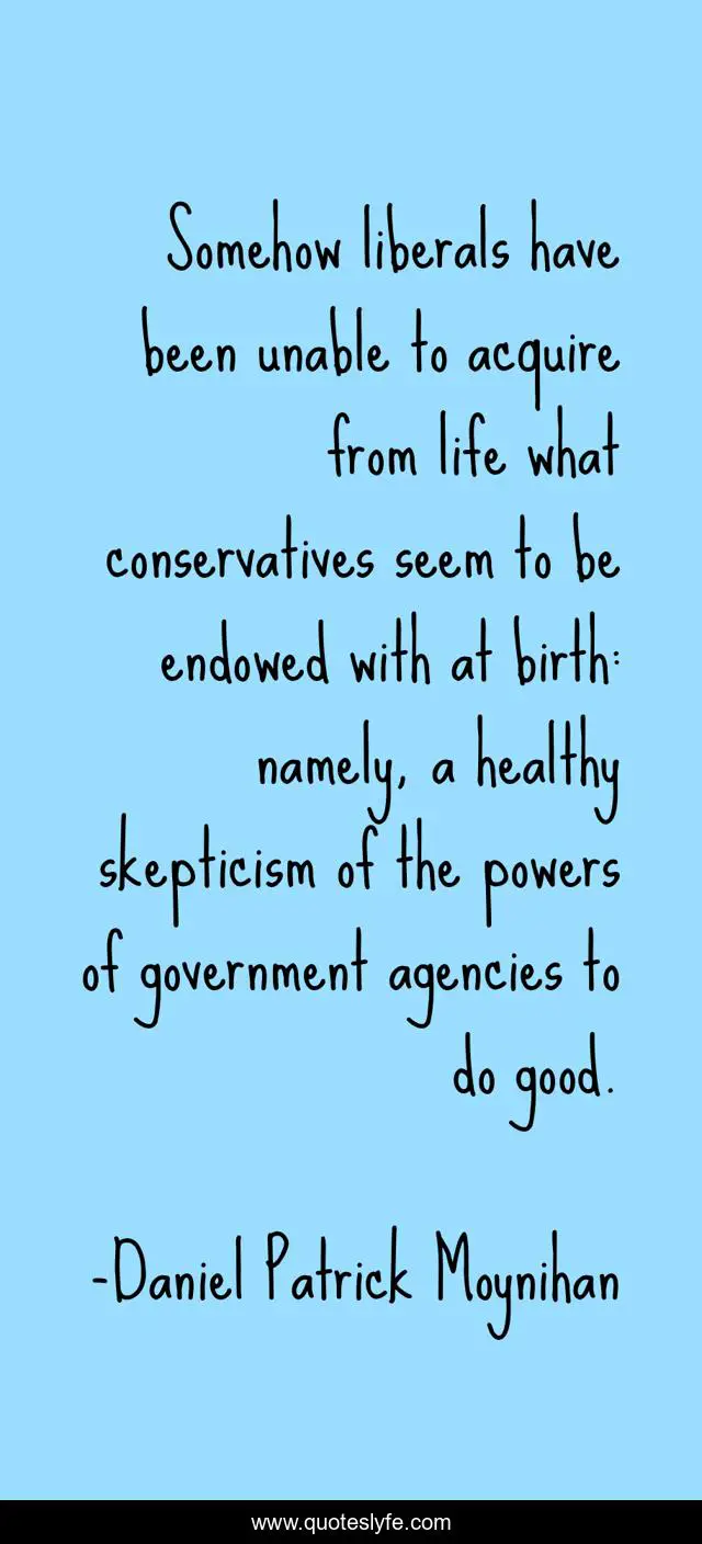 This page presents the quote "Somehow liberals have been unable to acquire from life what conservatives seem to be endowed with at birth: namely, a healthy skepticism of the powers of government agencies to do good.". Author of this quote is Daniel Patrick Moynihan. This quote is about healthy, life, good,.