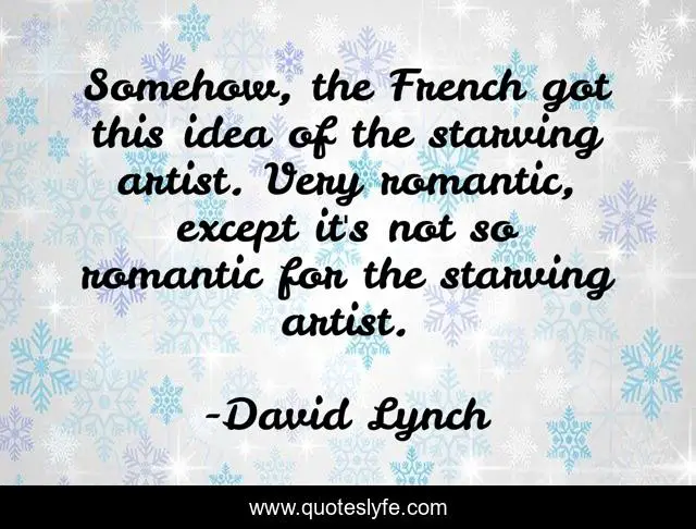 This page presents the quote "Somehow, the French got this idea of the starving artist. Very romantic, except it's not so romantic for the starving artist.". Author of this quote is David Lynch. This quote is about got, idea, artist,.