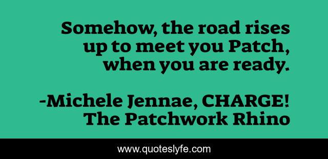 This page presents the quote "Somehow, the road rises up to meet you Patch, when you are ready.". Author of this quote is Michele Jennae, CHARGE! The Patchwork Rhino. This quote is about decisiveness, assistance, coincidence, preparation, action, serendipity,.