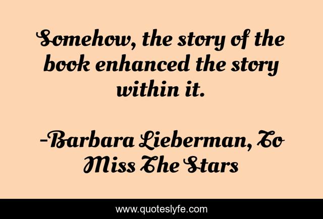 This page presents the quote "Somehow, the story of the book enhanced the story within it.". Author of this quote is Barbara Lieberman, To Miss The Stars. This quote is about story-of-the-book, story, books,.