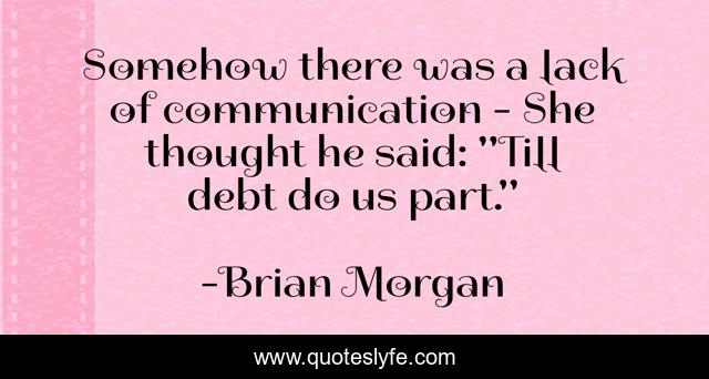This page presents the quote "Somehow there was a lack of communication - She thought he said: "Till debt do us part."". Author of this quote is Brian Morgan. This quote is about love, marriage, affection,.