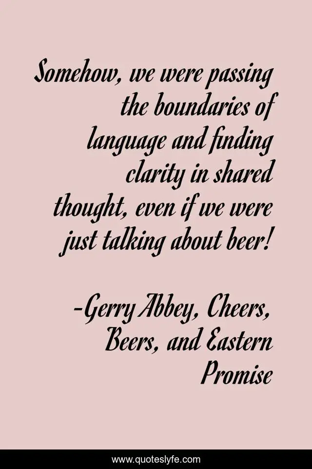 This page presents the quote "Somehow, we were passing the boundaries of language and finding clarity in shared thought, even if we were just talking about beer!". Author of this quote is Gerry Abbey, Cheers, Beers, and Eastern Promise. This quote is about southeast-asia, travel, travel-writing, asia, writing, drinking, teachers, inspirational, teaching,.